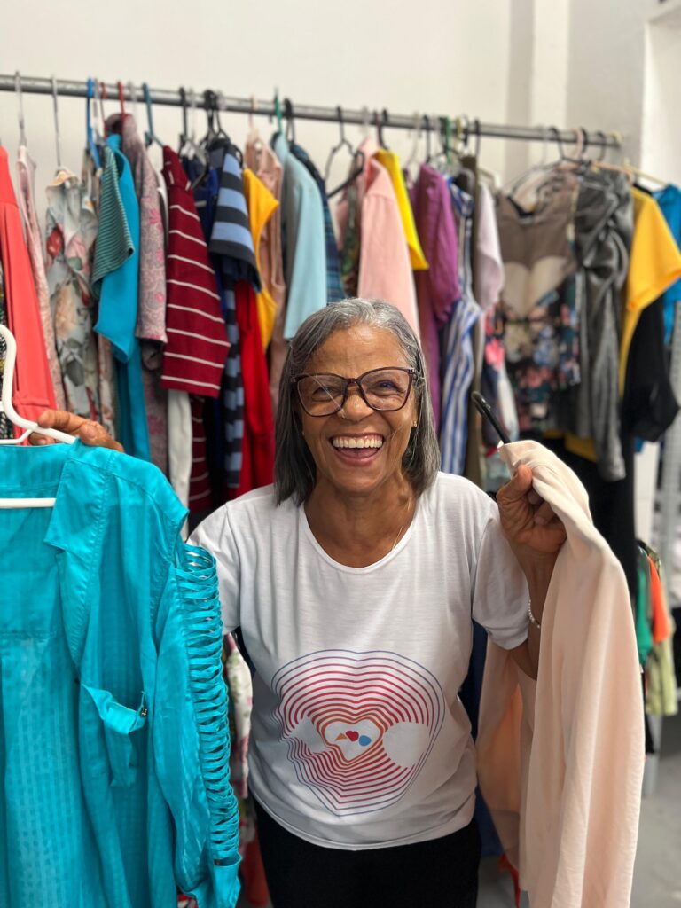 O sentimento de gratidão é compartilhado por Aparecida Lima. Aposentada e voluntária da AMO há 12 anos, ela divide seu tempo entre o projeto Pão Nosso e o brechó. Para ela, o trabalho é uma extensão do cuidado. “Eu amo trabalhar no Brechó, pois posso dar meu suporte aqui, disponibilizando meu tempo com muito amor e carinho. Ajudar o Brechó é um ato de empatia e solidariedade, no qual a pessoa pode levar sua peça para casa e ainda ajudar as pessoas”, afirma Aparecida.